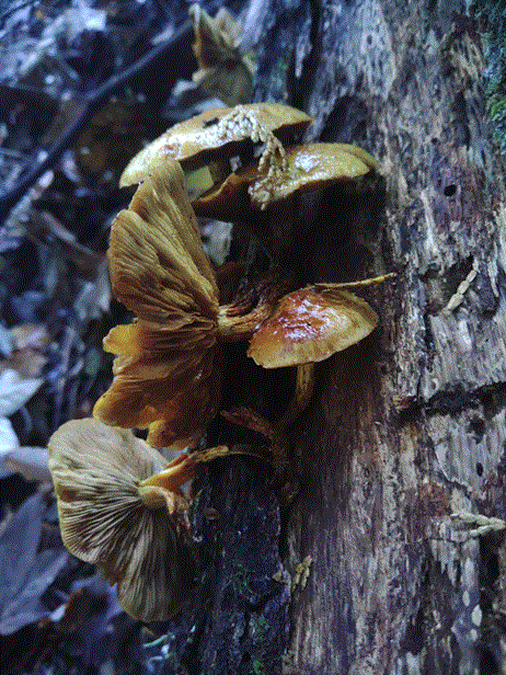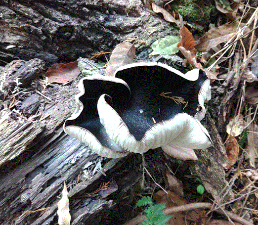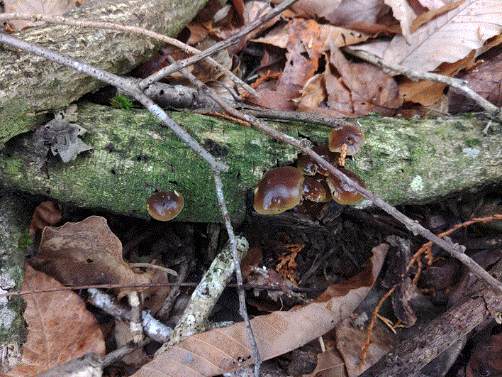 初夏から秋、立枯れの広葉樹の根際や倒木、その周辺に群生・単生。
